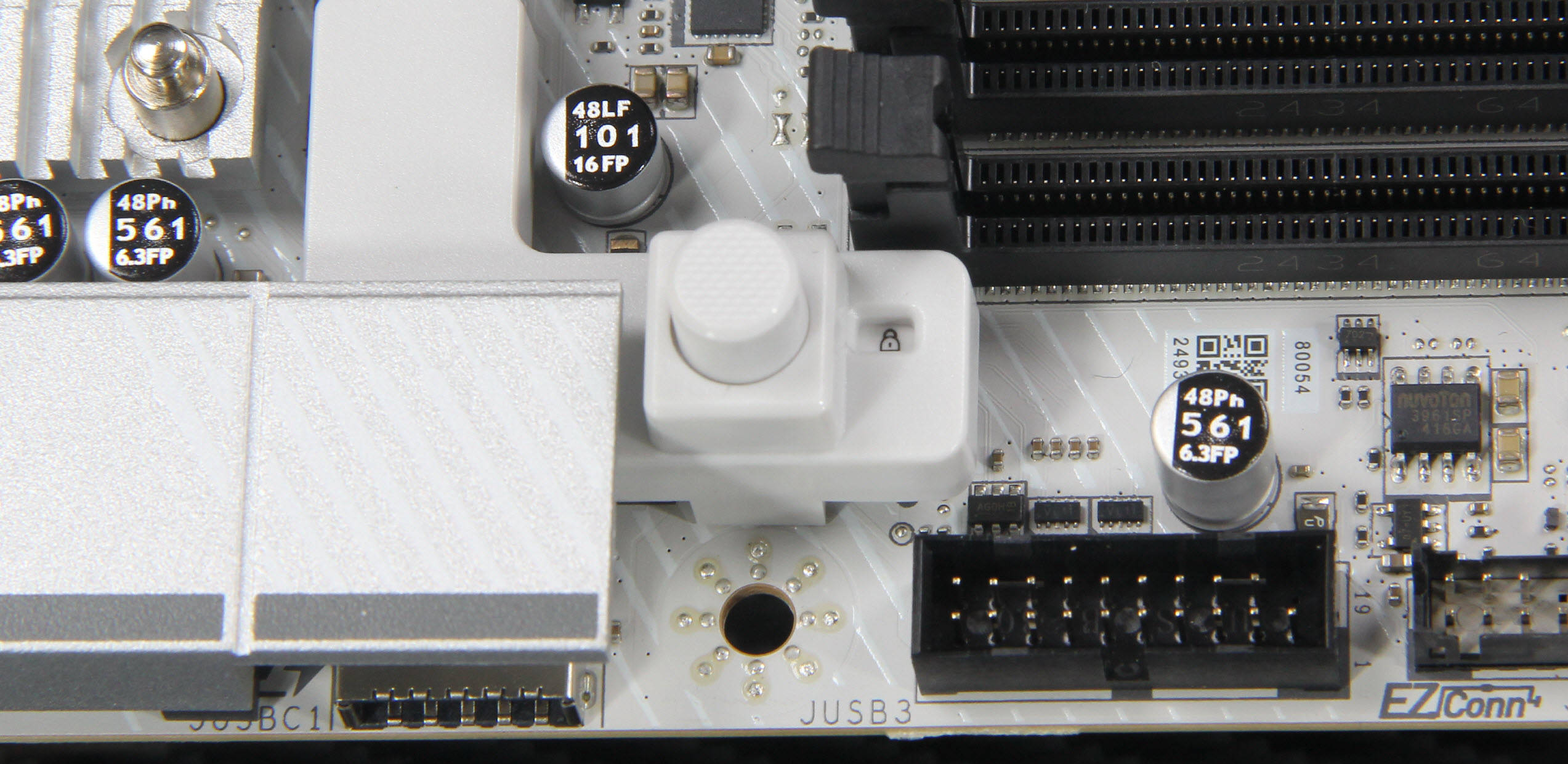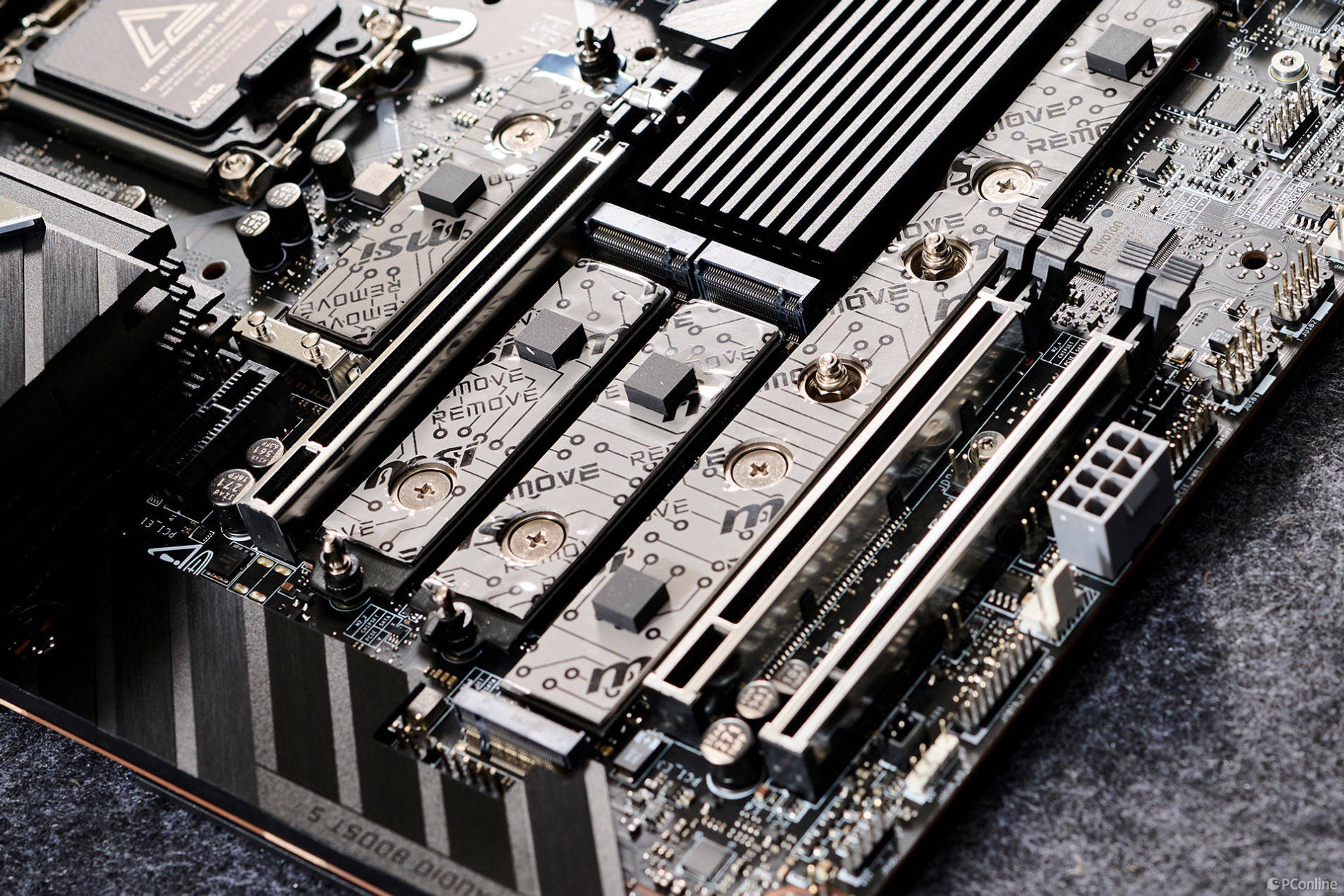 存储扩展上,主板提供了5个M.2接口,其中第一个支持PCIe 5.0×4(由CPU直出),其余四个支持PCIe 4.0×4,均配备了第二代双面EZ M.2 Shield Frozr散热铠甲。这种设计不仅有效降低M.2固态硬盘的温度,保证其在高速读写时的稳定性,还使得M.2硬盘的安装和更换变得更加便捷。