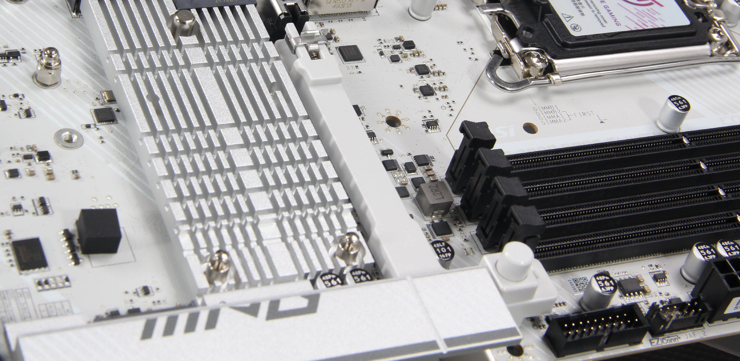 供电设计是MPG Z890 EDGE Ti的首要亮点。主板采用了16+1+1+1相智能供电设计,其中16相为VCore核心供电,每相配备90A的DrMOS,能够轻松应对Ultra 9 285K处理器的300W功耗需求。双8Pin的CPU供电接口位于主板右上方内存槽附近,避免了主板散热装甲的阻挡,使得插入CPU供电插头更为便捷。