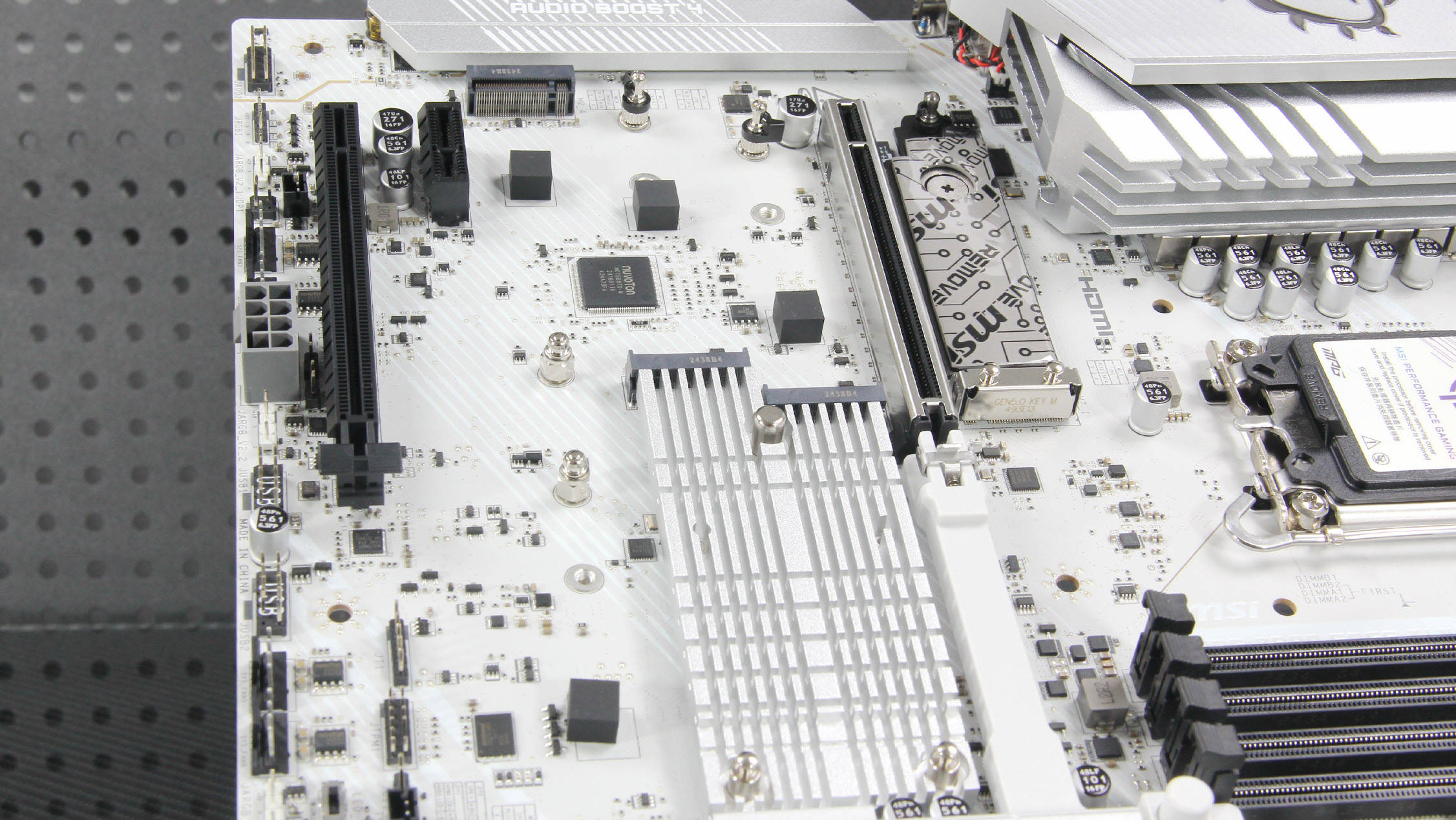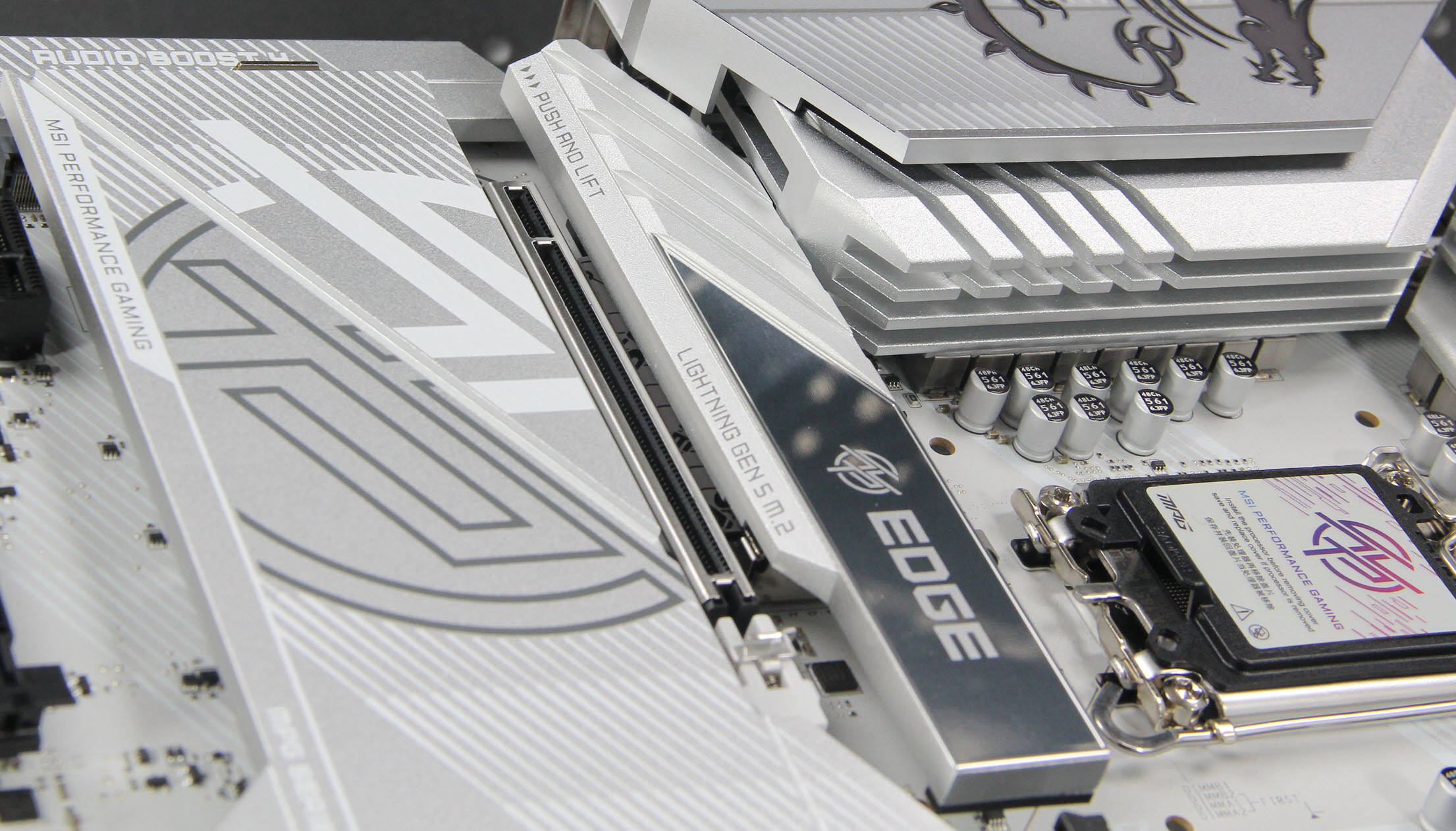 安装体验方面,微星MPG Z890 EDGE Ti WIFI刀锋钛主板做了多项优化。供电接口位置从传统的左侧移动到了内存上方,避免了线材交叉缠绕的问题,让用户在走线时更加方便。主板还采用了快拆设计,包括PCIe插槽金属加固快拆和M.2卡扣免工具拆卸,大幅提升装机效率。