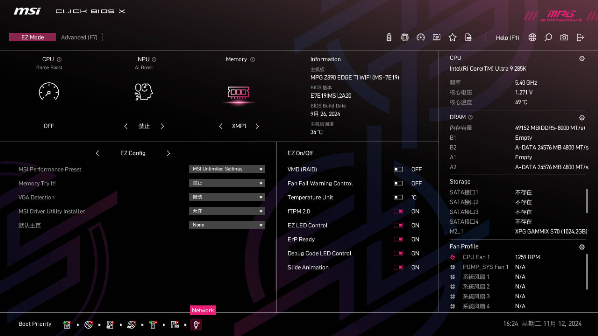 最值得称赞的是主板的供电接口位置设计,从传统的左侧移动到了内存上方,这一设计优化解决了装机时因水冷排遮挡导致的接线困难问题,大大提升了装机体验。同时,主板预设了四种性能模式:Intel默认设置、MSI性能设置、MSI极端设置和MSI无限设置,用户可以根据自己的需求选择最适合的模式。