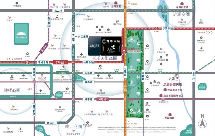 长乐天街TOD可快速串联东二环及东三环,近距离西安高架快速干道,30分钟串联主城内、浐灞、曲江,享30分钟主城生活圈,享多中心围合,中心级高端消费地,虹吸海量客流。