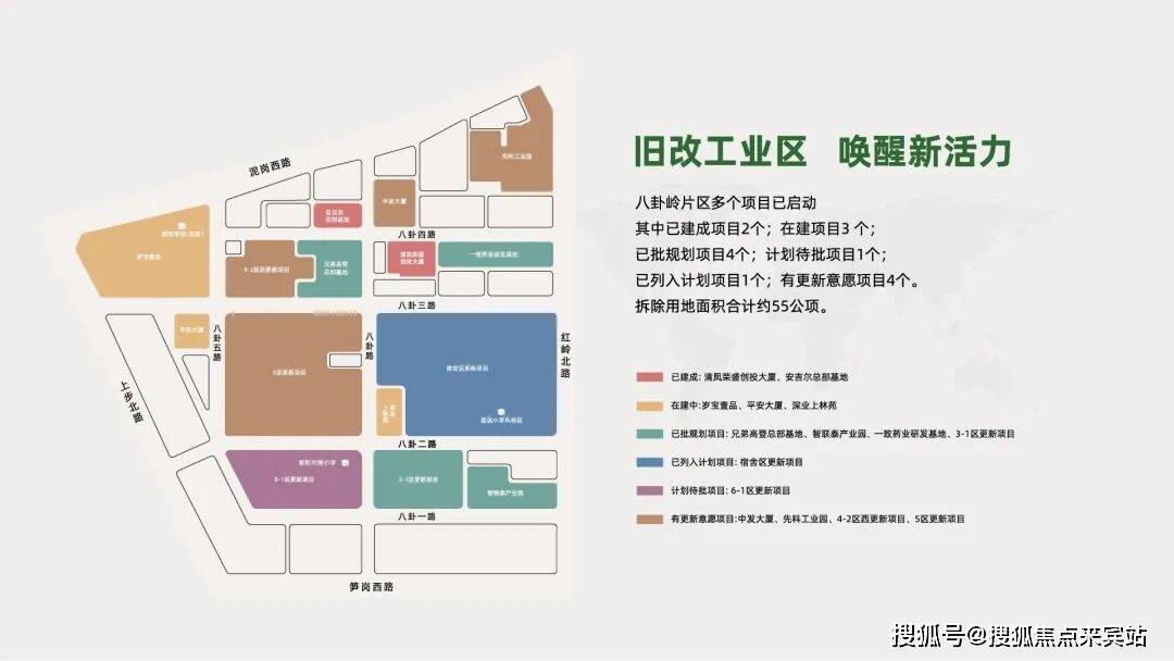 八卦岭片区多个项目已启动,其中已建成项目2个,在建项目3个,已批规划项目4个,列入计划项目1个,计划待批项目1个,有更新意愿项目4个。拆除用地面积合计约55公顷。